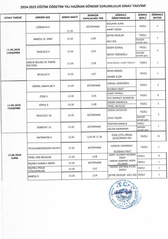 Haziran Ayı Sorumluluk Sınav Takvimi